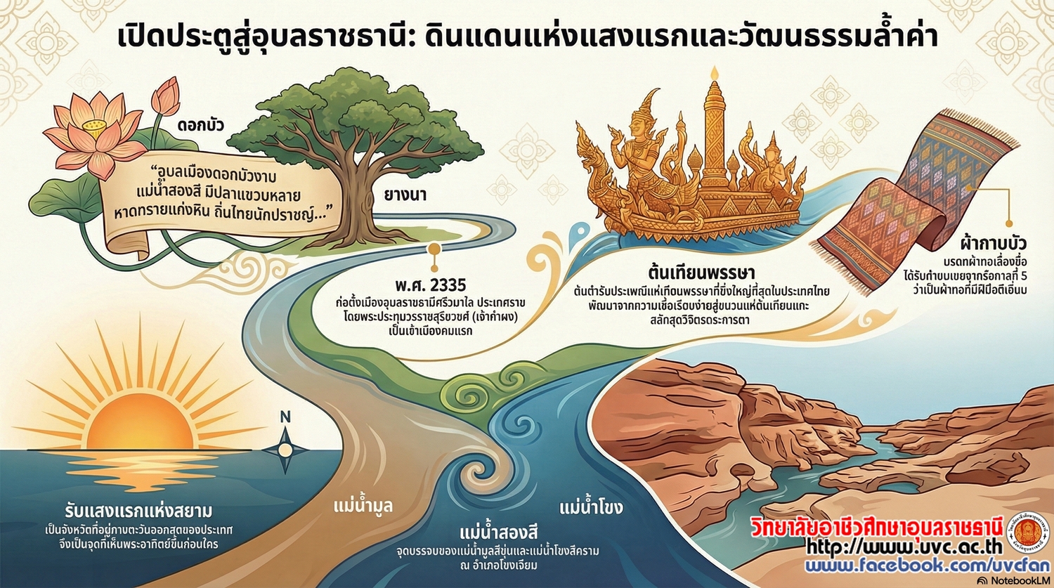 คำขวัญประจำจังหวัด: อุบลเมืองดอกบัวงาม แม่นำสองสี มีปลาแซบหลาย หาดทรายแก่งหิน ถิ่นไทยนักปราชญ์ ทวยราษฎร์ใฝ่ธรรม งามล้ำเทียนพรรษา ผาแต้มก่อนประวัติศาสตร์ ฉลาดภูมิปัญญาท้องถิ่น ดินแดนอนุสาวรีย์คนดีศรีอุบล