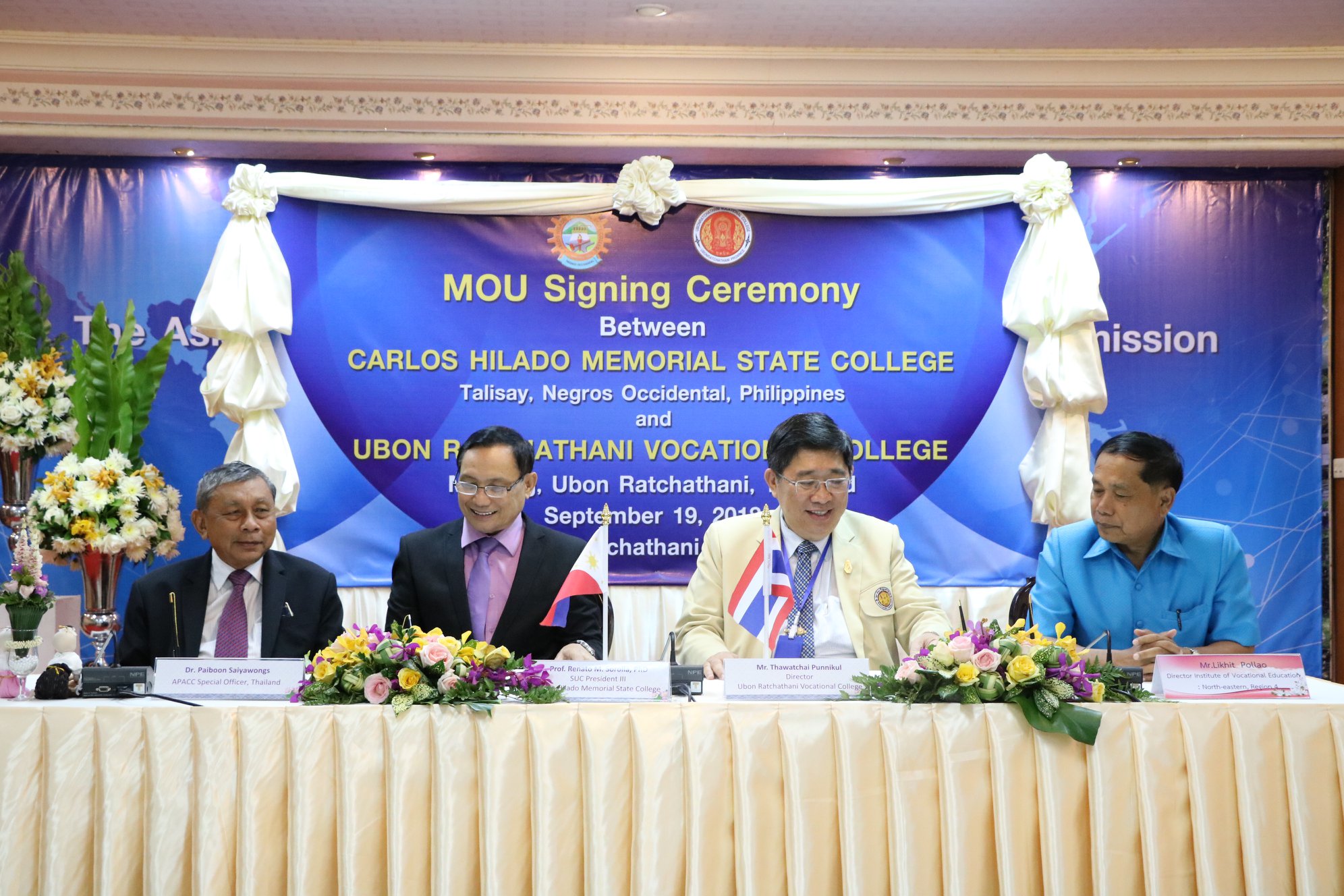 นอกจากนั้นวิทยาลัยอาชีวศึกษาอุบลราชธานี ยังได้ร่วมลงนามความร่วมมือด้านการจัดการเรียนการสอนร่วมกัน ระหว่าง วิทยาลัยCarlos Hilado memorial state college ประเทศฟิลิปปินส์ กับวิทยาลัยอาชีวศึกษาอุบลราชธานี มี นายลิขิต พลเหลา ผู้อำนวยการสถาบันการอาชีวศึกษาภาคตะวันออกเฉียงเหนือ 4, ดร.ไพบูลย์ ใสยาวงศ์ ผู้ทรงคุณวุฒิด้านที่ปรึกษากลุ่มงานประกันคุณภาพอาชีวศึกษา ร่วมเป็นเกียรติและเป็นสักขีพยานในพิธีลงนามความร่วมมือ ระหว่าง วิทยาลัยอาชีวศึกษาอุบลราชธานี สำนักงานคณะกรรมการการอาชีวศึกษา ลงนามโดย นายธวัชชัย พันธ์นิกุล ผู้อำนวยการวิทยาลัยอาชีวศึกษาอุบลราชธานี และวิทยาลัยCarlos Hilado memorial state college ประเทศฟิลิปปินส์ ลงนามโดย Dr. Renato Sorolla ผู้อำนวยการวิทยาลัยCarlos Hilado memorial state college
