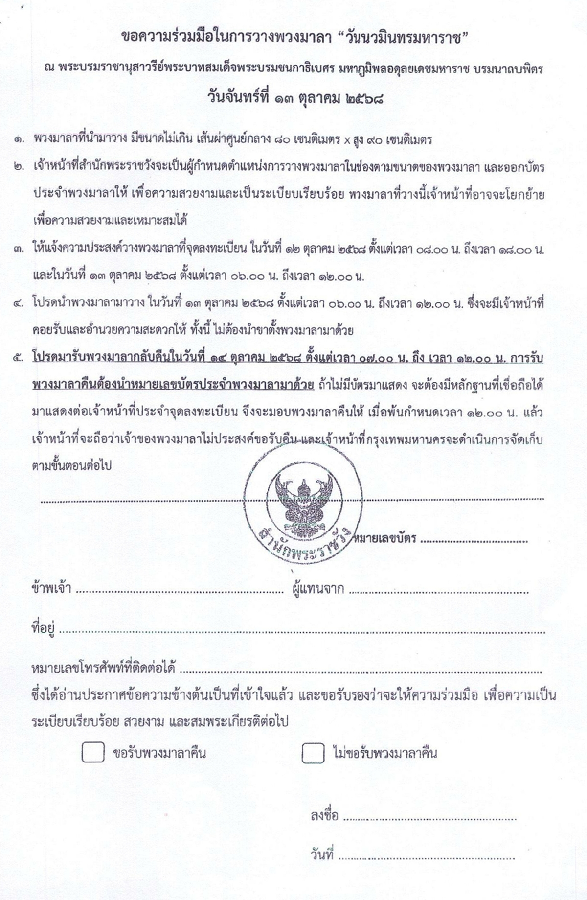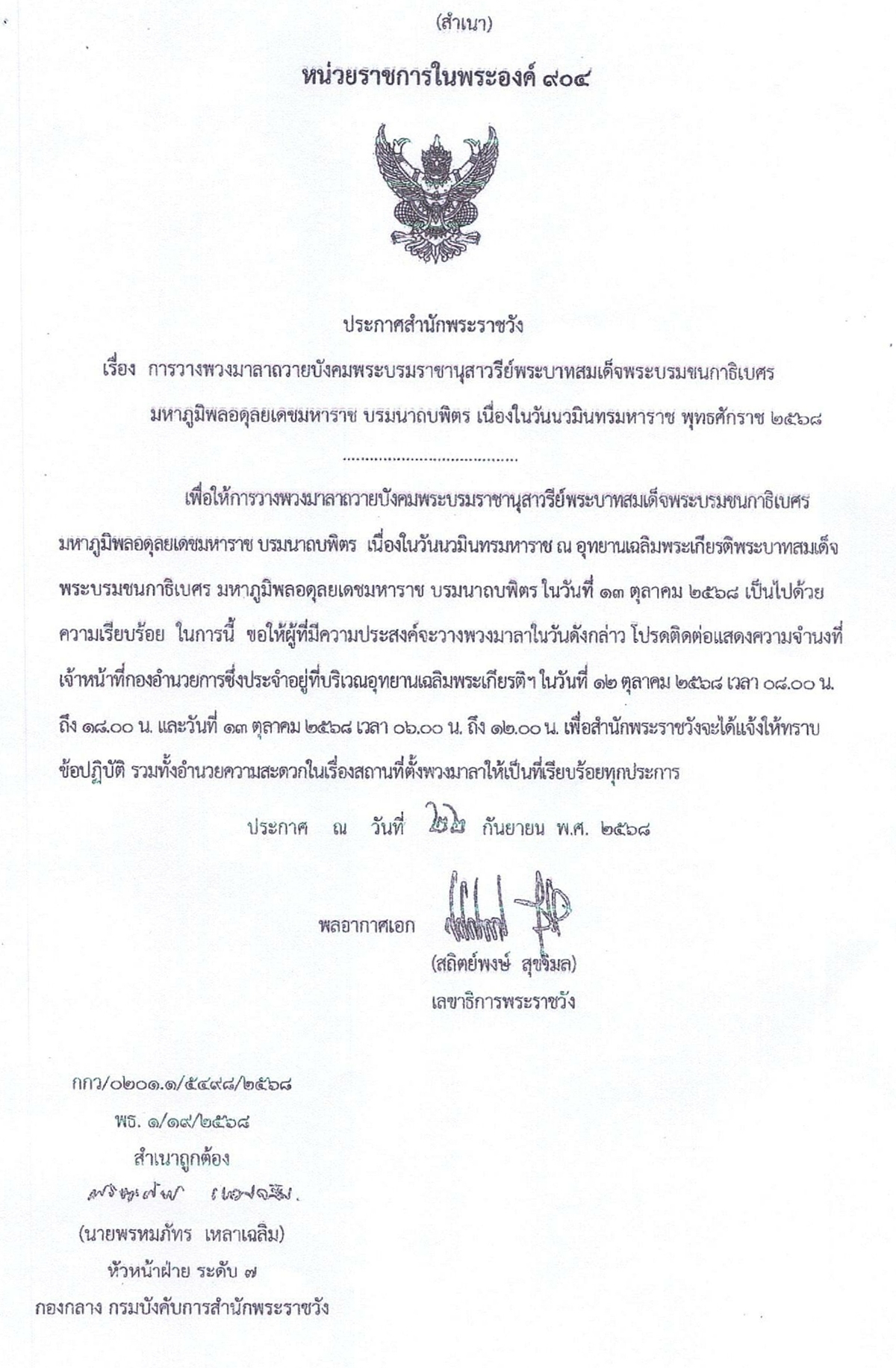 การวางพวงมาลาถวายบังคมพระบรมราชานุสาวรีย์พระบาทสมเด็จพระบรมขนกาธิเบศร มหาภูมิพลอดุลยเดชมหาราช บรมนาถบพิตร เนื่องในวันนวมินทรมหาราช พุทธศักราช ๒๕๖๘