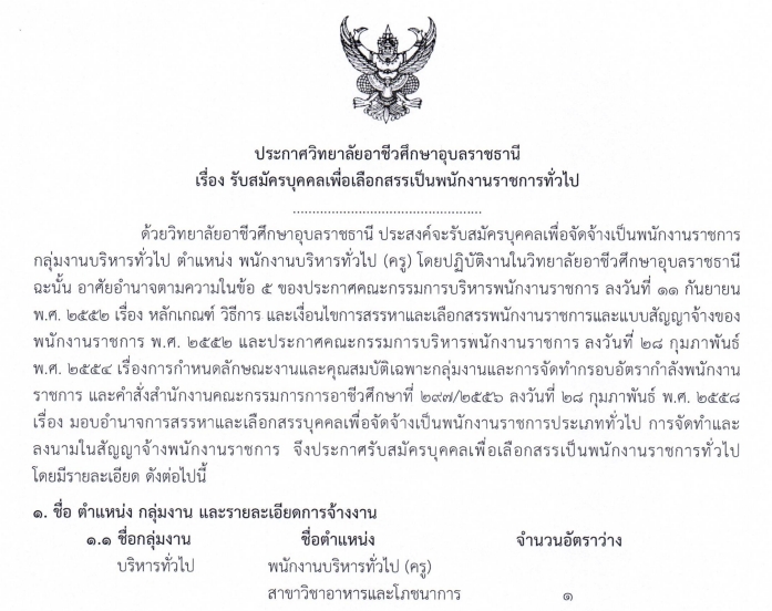 ประกาศรับสมัครบุคคลเพื่อเลือกสรรเป็นพนักงานราชการทั่วไป (ครู) สาขาอาหารและโภชนาการ